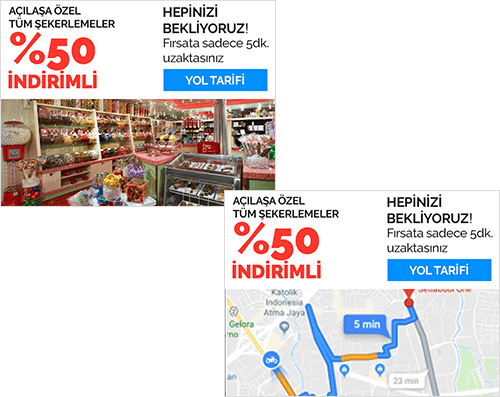 Bu sayede potansiyel müşterilerinize tek bir banner reklam ile konumunuzu, kullanıcının konumunuza uzaklığını, ürünlerinizi ve sunduğunuz fırsatı ulaştırabilirsiniz.
